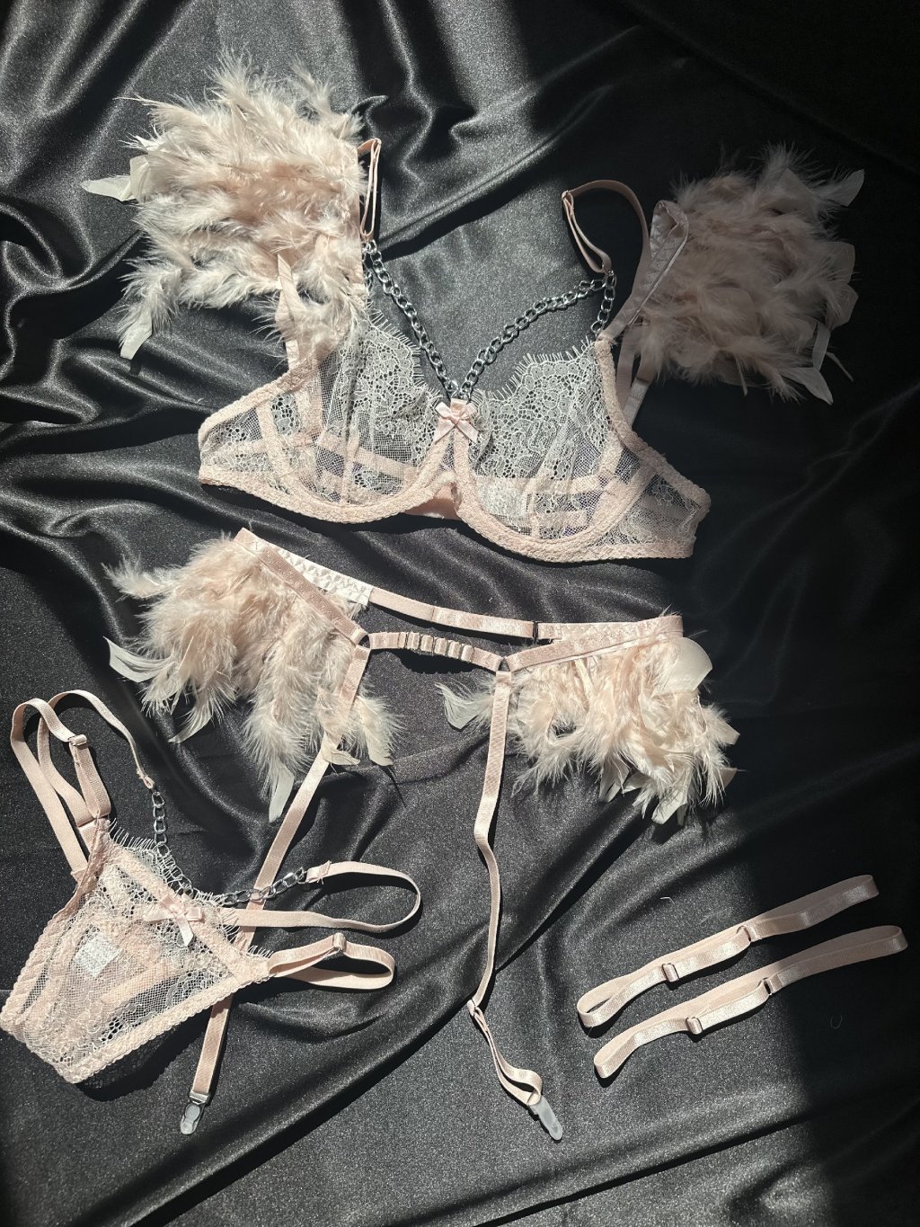 Krásny bledo-ružový set s pierkami. Veľkosť si viete nastaviť 1-2cm presne na Vašu postavu.